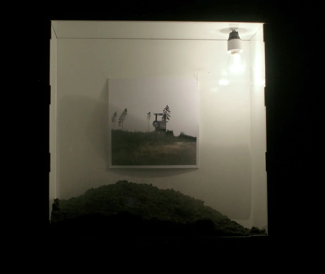 Journeys Back consisted of four individual vitrine style, Plexiglas-fronted cabinets. The cabinets were mounted next to one another in a row on a bare concrete wall in a darkened space. Each vitrine contained a different colour photograph of a hunting tower, borrowed from my photographic series Hunting Towers. Each cabinet was fitted with a bare light bulb.